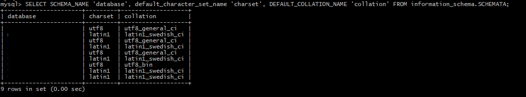 SELECT SCHEMA_NAME 'DATABASE', DEFAULT_CHARACTER_SET_NAME 'CHARSET', DEFAULT_COLLATION_NAME 'COLLATION' FROM INFORMATION_SCHEMA.SCHEMATA;
