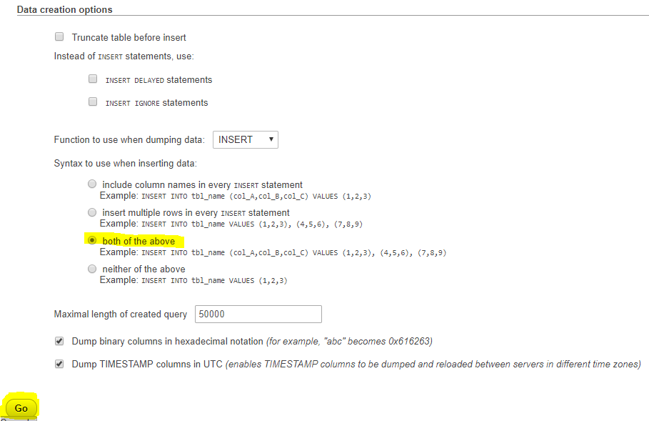 Last but not the least, Navigate to the Data Creation Option and select the following options. Once you have made the selection, click on the GO button and save the file on your computer file system. A dialog box will pop up, simply give a meaning full name to the file and save it.