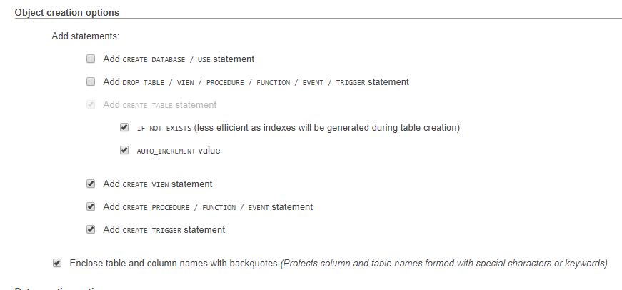 Navigate to the Object Creation Sectionand select the following. Make sure you tick the AUTO_INCREMENT value and IF NOT EXISTS options. Refer the image below,